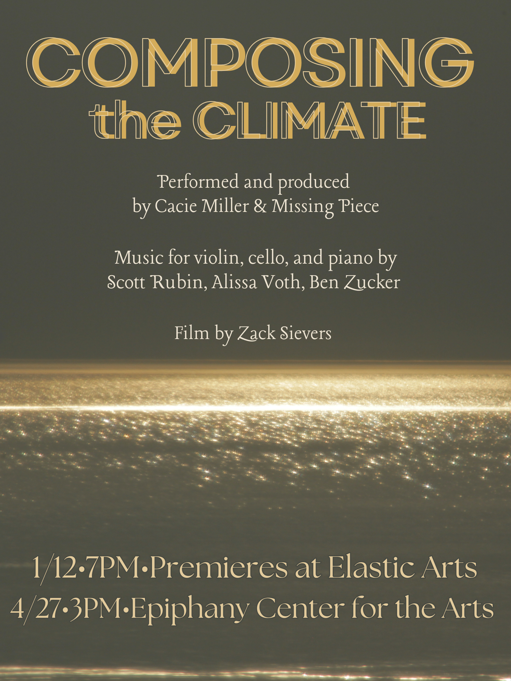 In Summer/Fall of 2024 composers Scott Rubin, Alissa Voth and Ben Zucker wrote new piano trios exploring themes of climate change through lenses of society, history and emotional processing. These new works were premiered on January 12, 2025, in collaboration with Missing Piece at Elastic Arts. A companion show took place on April 27, 2025 at Epiphany Center for the Arts. This show also includes new films by Zack Sievers.